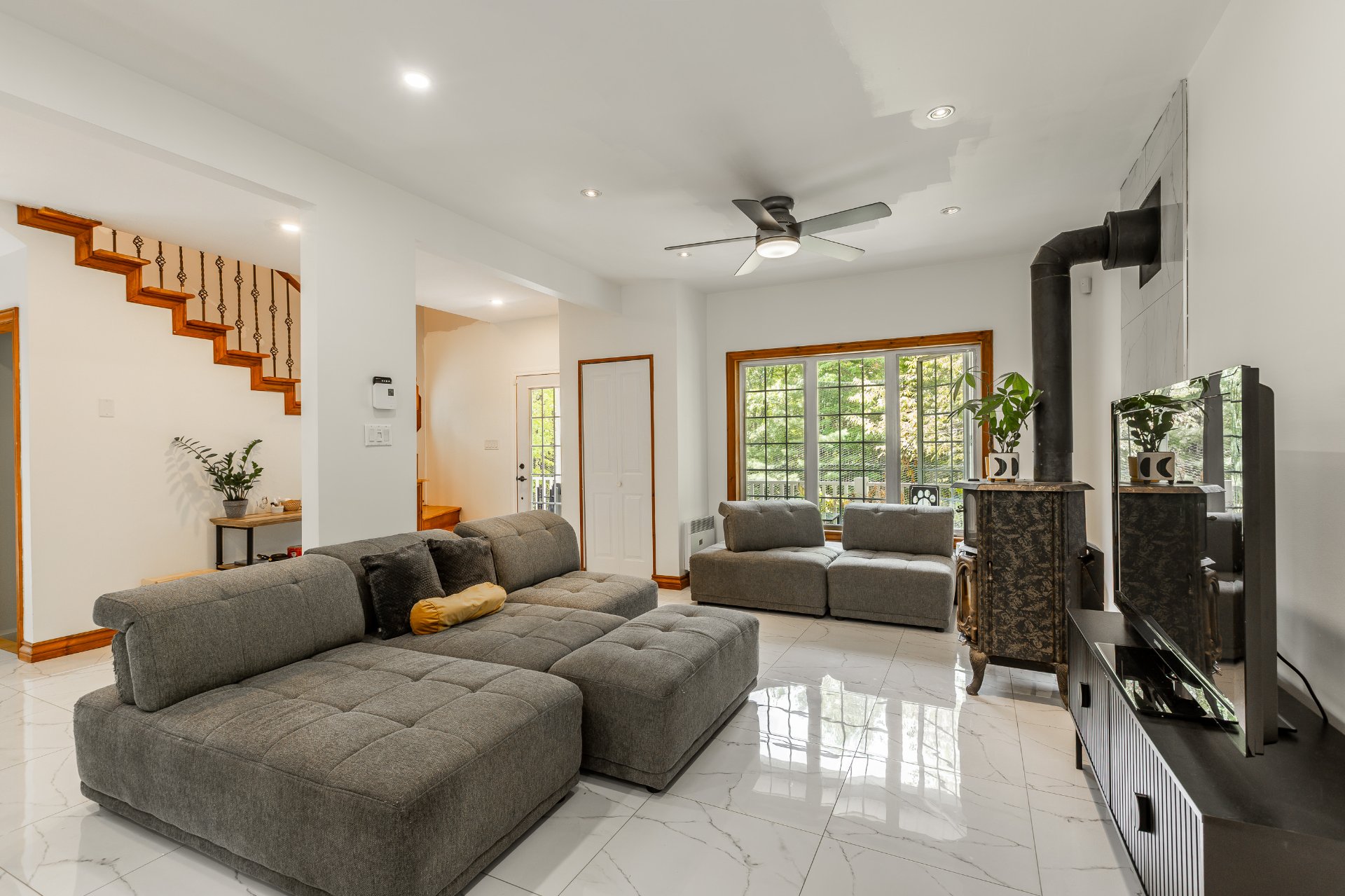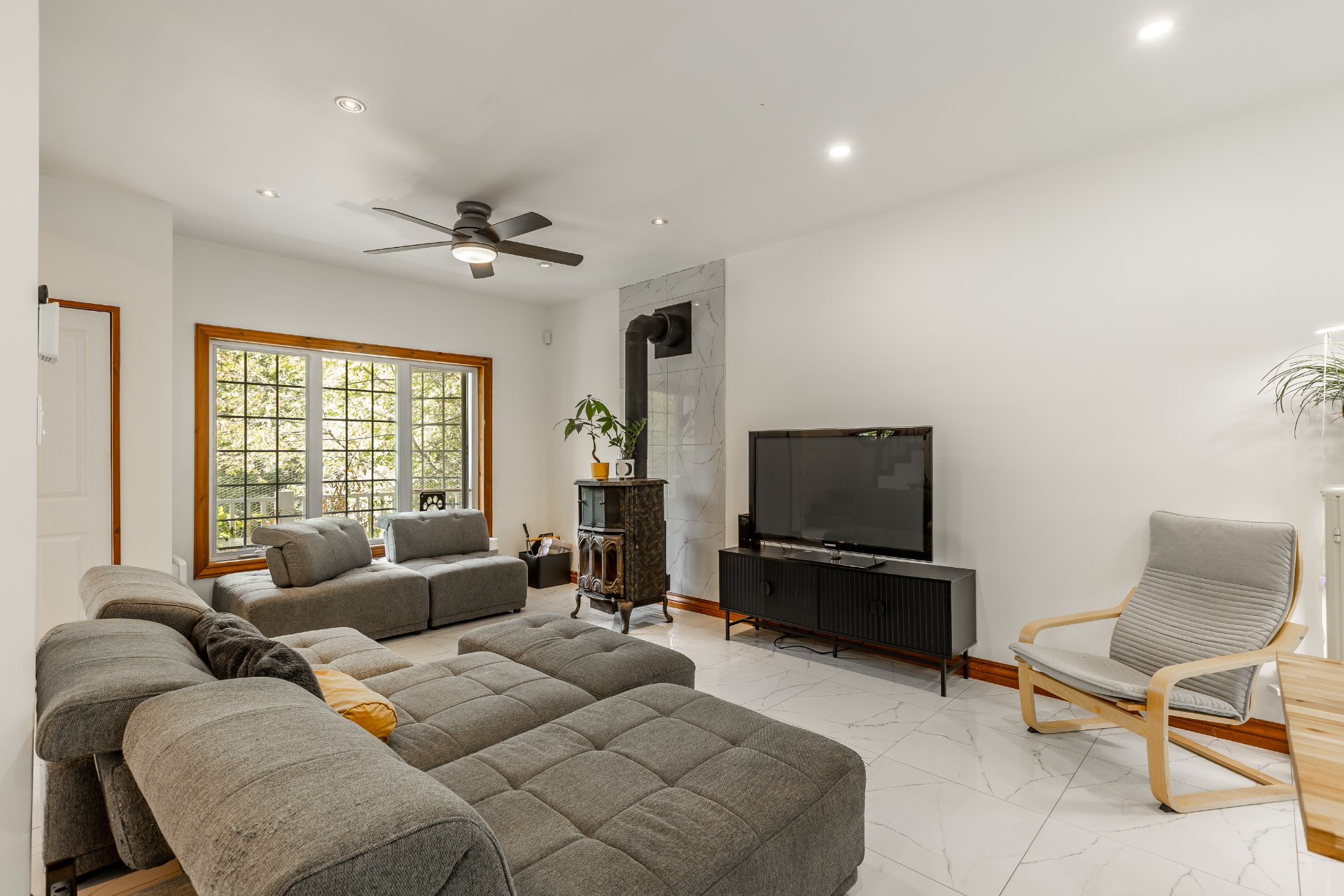 *Salon très lumineux avec grand foyer rustique fonctionnel