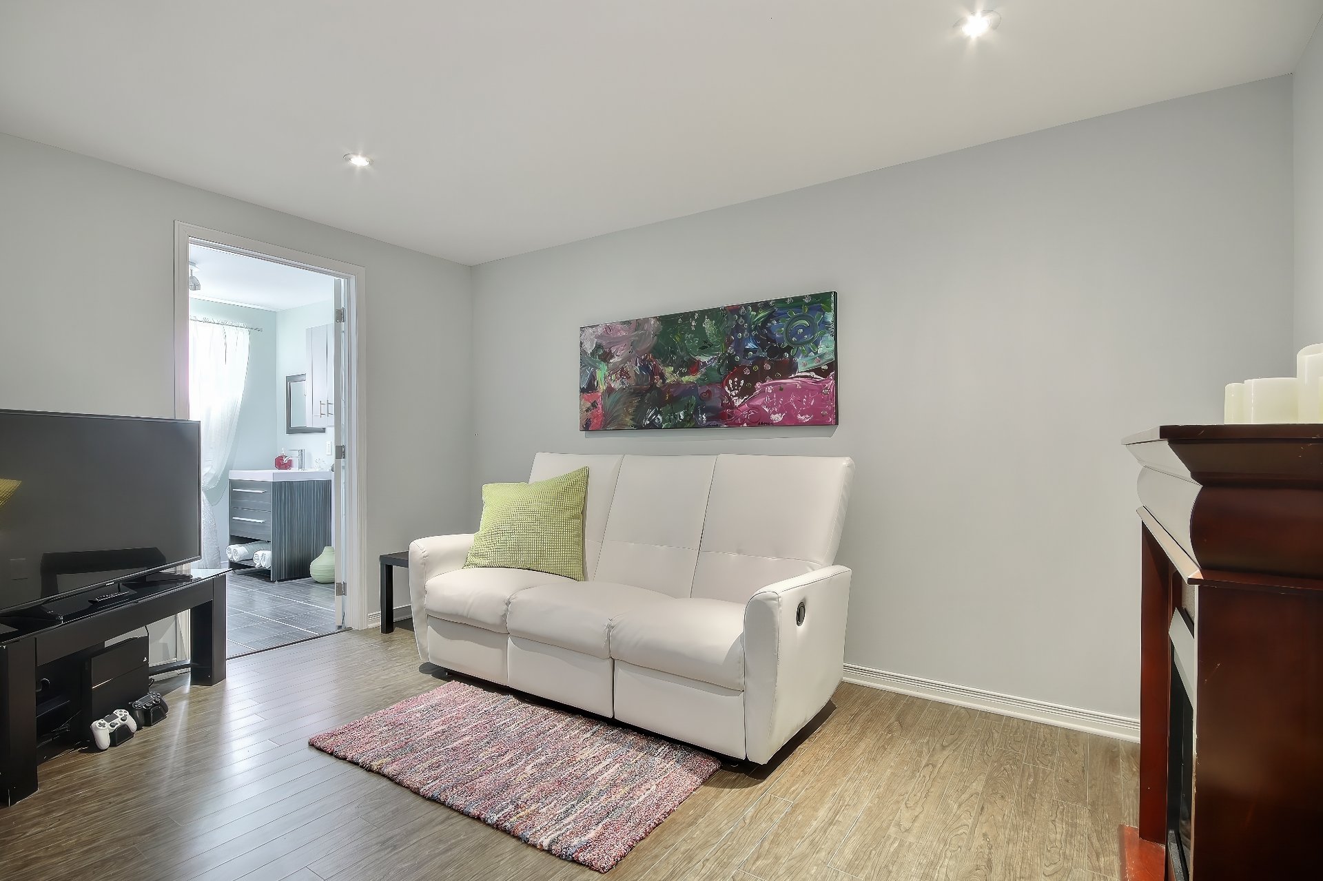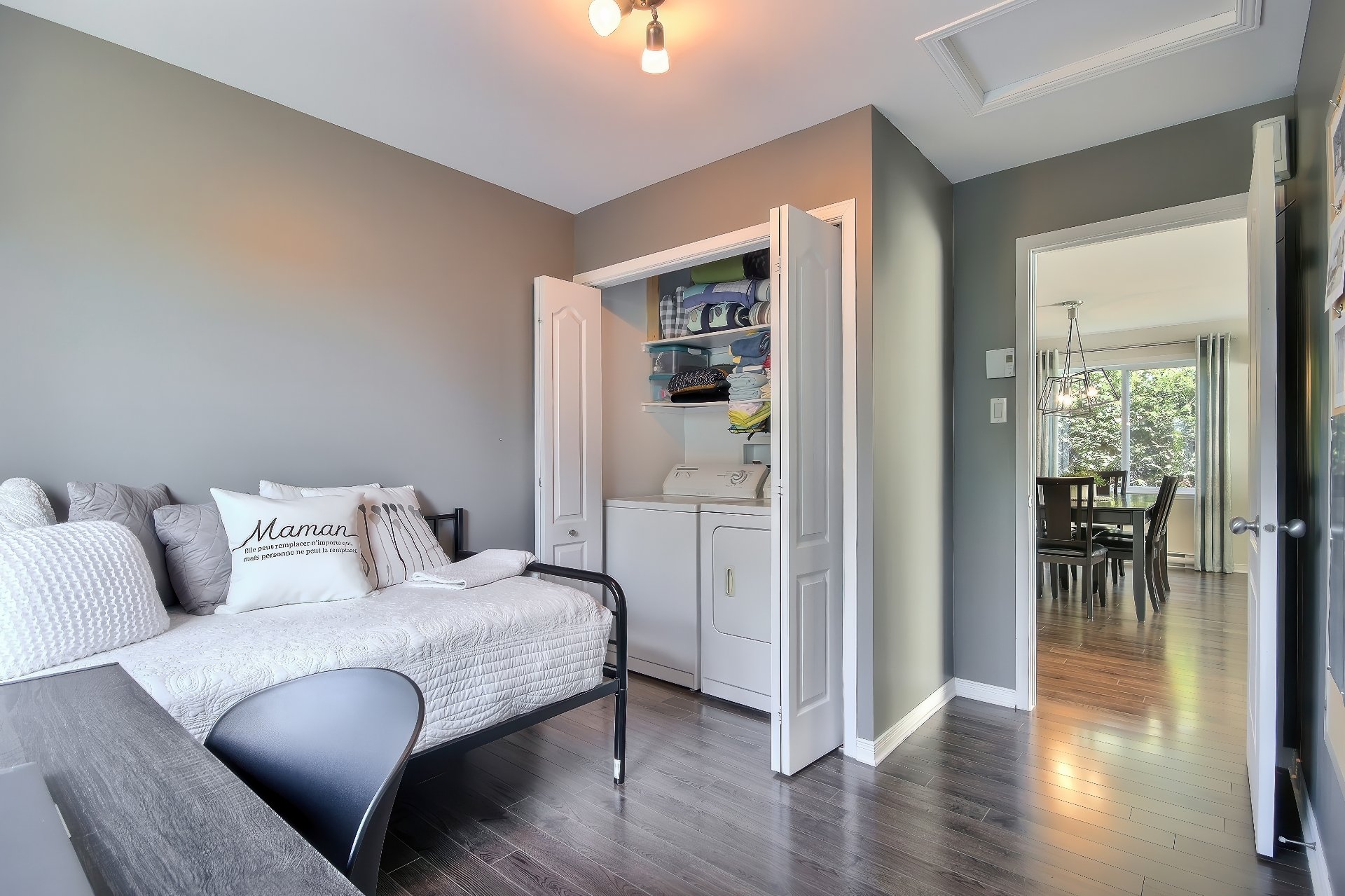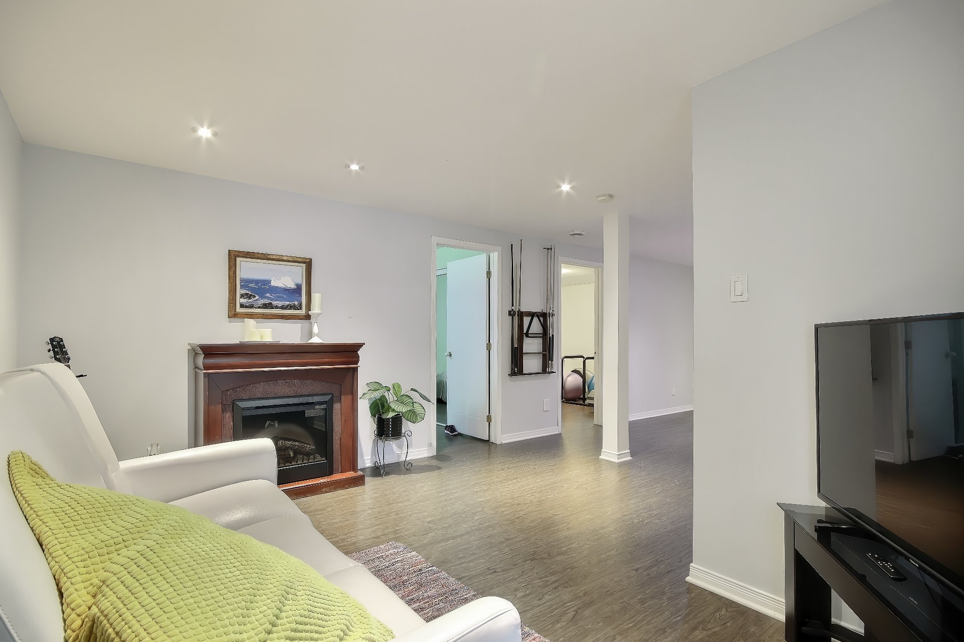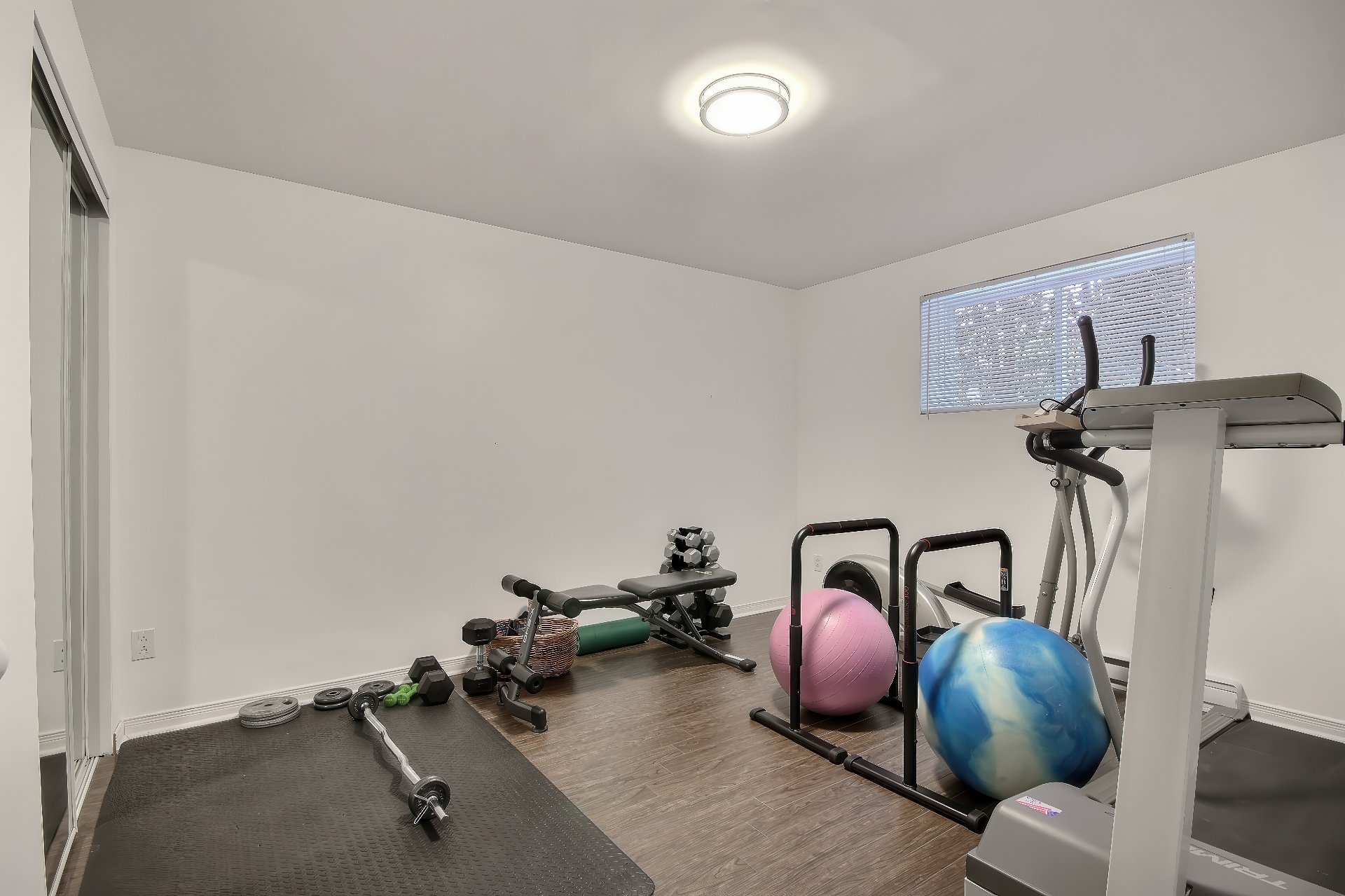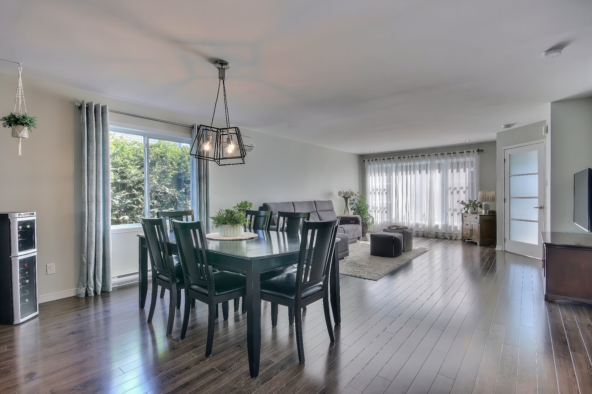 Voir plus Voir moinsLave-vaisselle, pôle à rideaux du salon et support télé de la salle d'exercice