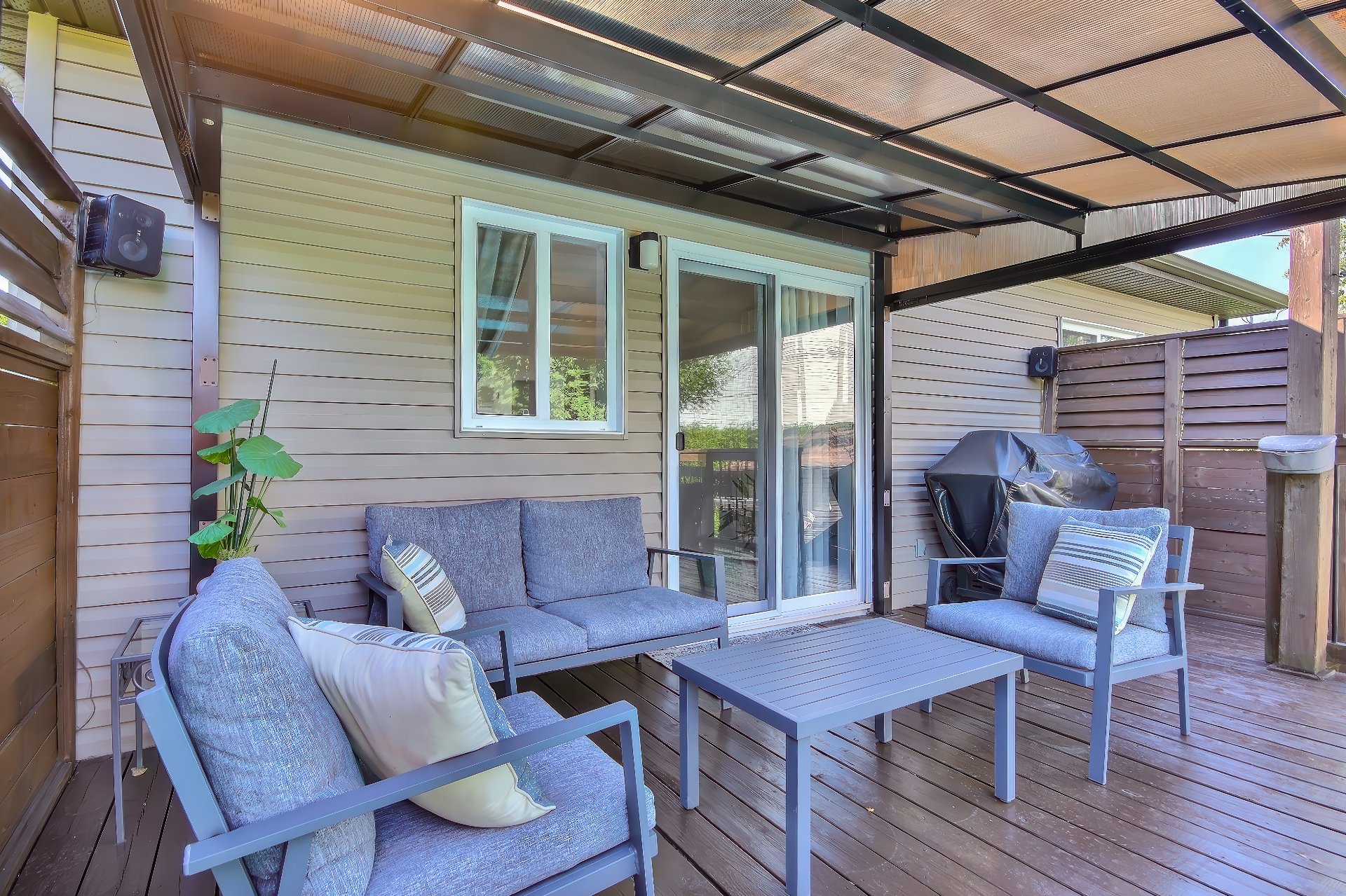 Luminaires, pôles à rideaux (sauf celle du salon), stores, balayeuse centrale et accessoires, gazebo et toiles, système de son avec 4 haut-parleurs (2 sur le balcon et 2 sur cabanon), + 2 cabinets d'armoires cuisine a...